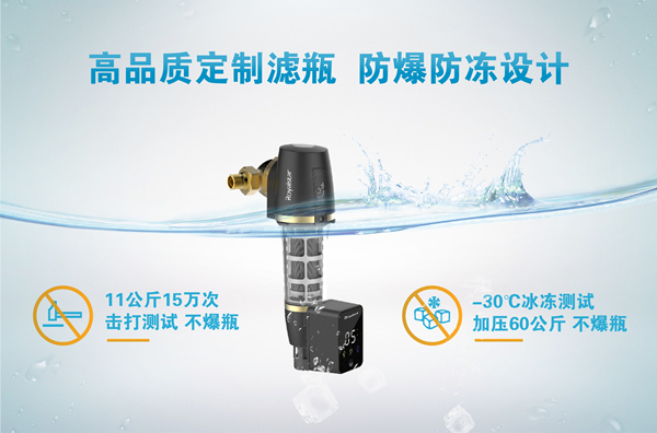 對于傳統(tǒng)前置過濾器來說一直存在一個(gè)隱患,那就是在低溫冰凍或是高壓水錘等情況下,容易引發(fā)濾瓶爆裂,令許多用戶頭疼不已。其實(shí),回歸根本來說,還是因?yàn)闉V瓶材質(zhì)不佳。榮事達(dá)為攻克這一難題,可謂是下足功夫。智能前置過濾器濾瓶采用獨(dú)特配方和原裝進(jìn)口材料,不含雙酚A,濾瓶無注塑點(diǎn),并通過NSF、SGS檢測,經(jīng)過改性配方與防爆防凍極限抗壓測試,11公斤15萬次擊打不爆瓶,-30℃冰凍測試加壓60公斤不爆瓶,濾瓶綜合性能有著質(zhì)的飛躍,保證用戶使用安心。