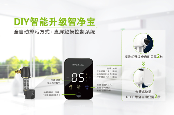 值得一提的是,為進(jìn)一步方便用戶使用,提升產(chǎn)品體驗(yàn),榮事達(dá)為第五代、第六代智能前置過濾器分別打造兩款定制化新品,量身融入智凈寶自動(dòng)排污模塊,2秒即可直接加裝升級。專屬定制的DIY智凈寶配備了直屏觸控排污系統(tǒng),輕觸即可任意設(shè)置排污時(shí)間和排污天數(shù),實(shí)現(xiàn)完全自主排污;獨(dú)特排污閥閉合自檢能力,徹底排除漏水風(fēng)險(xiǎn),方便省心,使用無憂。