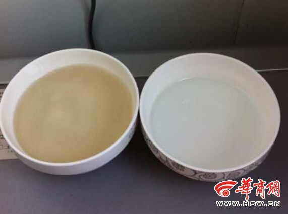 昨日下午,在該小區(qū),華商報(bào)記者看到,小楊家的自來水確實(shí)呈淡黃色,通過凈化后,水就變得清澈透明。淡黃色的水沒有氣味,喝下去也基本沒有味道。