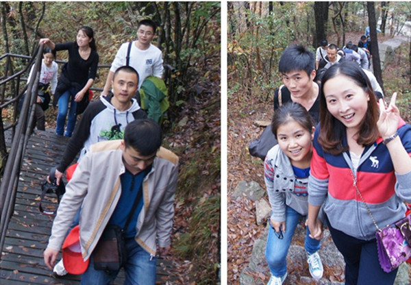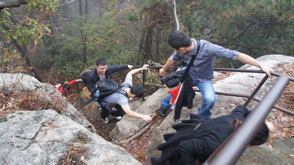 到達目的地用過午餐,全體成員便整裝待發(fā),完成此次拓展訓(xùn)練最艱難的項目--攀登天屏峰。天屏峰海拔高度1605米,山峰險峻、陡峭無比,全路段多為樹根、石塊堆出的小道,多處攀爬必須手腳并用,甚至要靠隊友幫助,攀登而上極為挑戰(zhàn)體能。