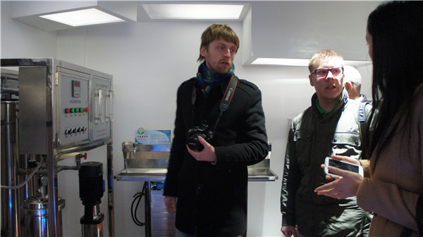 在榮事達(dá)家電研發(fā)中心二樓展廳,色彩紛呈、形態(tài)各異的凈水產(chǎn)品引得許多乘客注目凝視。出于對自動售水機(jī)的好奇,考察團(tuán)許多成員一進(jìn)門便被吸引過去,通過介紹,他們紛紛夸這個(gè)大家伙方便好用。看到精致漂亮的“梅、蘭、竹、菊”純水機(jī)時(shí),兩名俄羅斯女士不禁用英語單詞“nice”表達(dá)了自己的喜愛之情。