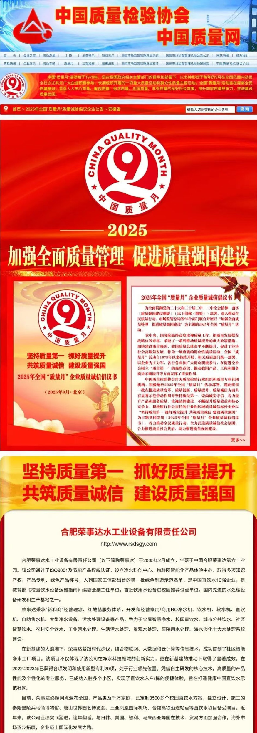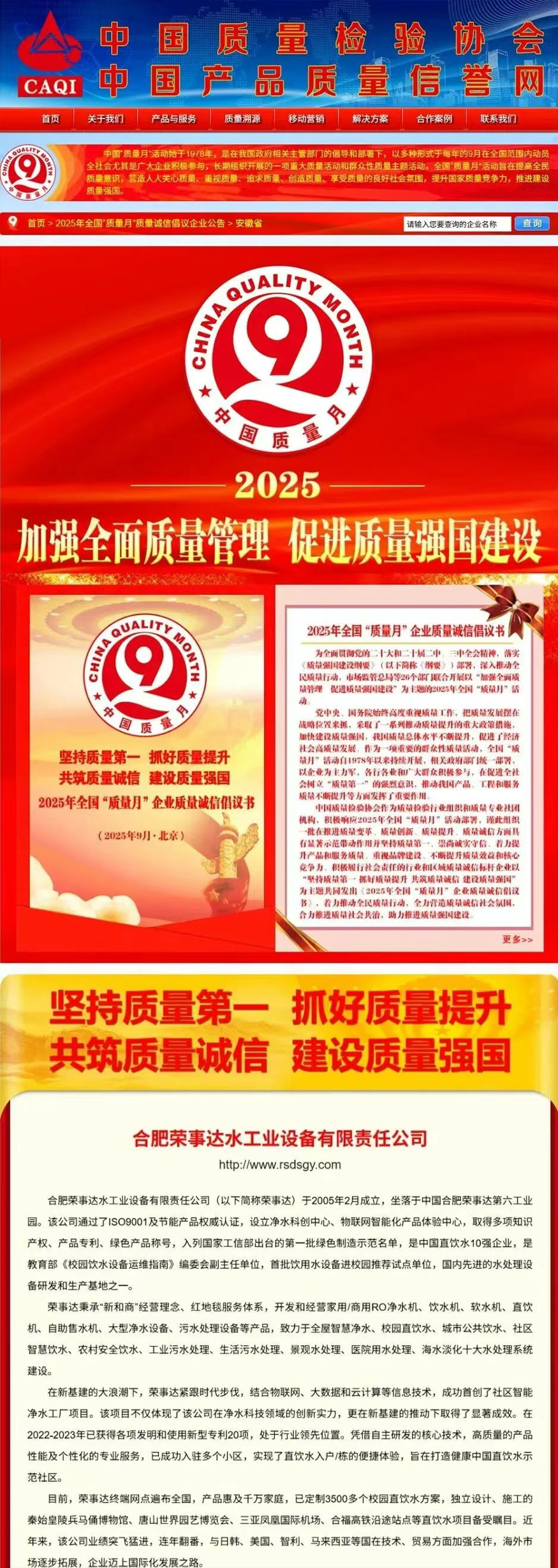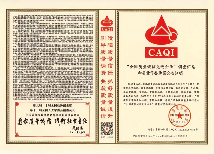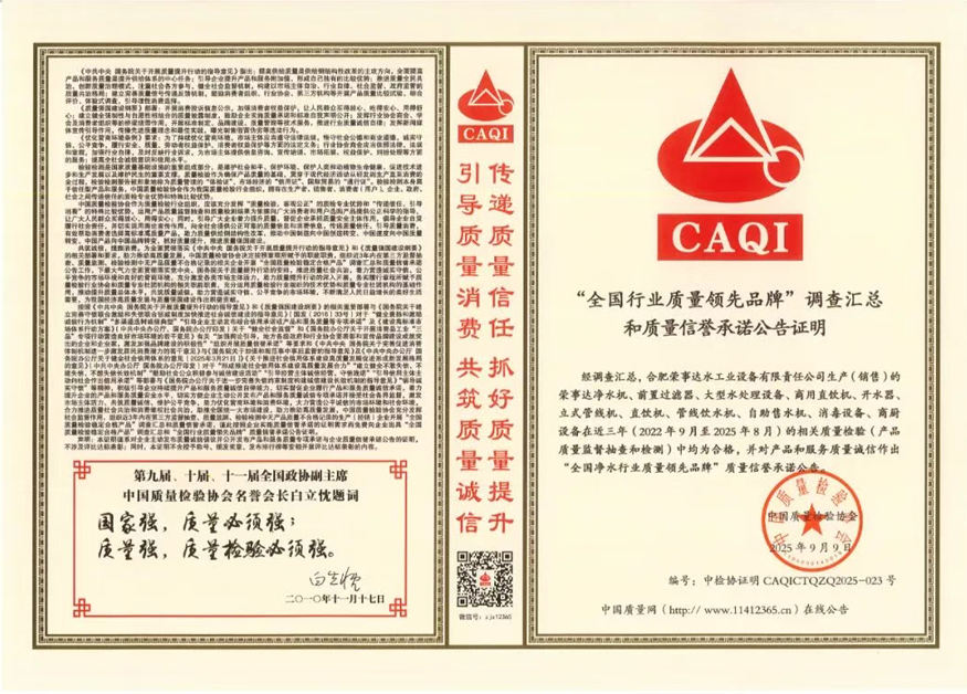 加強(qiáng)質(zhì)量支撐,共建質(zhì)量強(qiáng)國(guó)。在由中國(guó)質(zhì)量檢驗(yàn)協(xié)會(huì)牽頭組織的2025年全國(guó)“質(zhì)量月”企業(yè)質(zhì)量誠(chéng)信倡議專(zhuān)題活動(dòng)中,榮事達(dá)水工業(yè)公司憑借長(zhǎng)期以來(lái)對(duì)產(chǎn)品品質(zhì)的嚴(yán)苛堅(jiān)守與積極正向的社會(huì)形象,成功通過(guò)協(xié)會(huì)多維度審核與專(zhuān)家團(tuán)專(zhuān)業(yè)評(píng)定,最終一舉斬獲“全國(guó)凈水行業(yè)質(zhì)量領(lǐng)先品牌”“全國(guó)質(zhì)量誠(chéng)信先進(jìn)企業(yè)”“全國(guó)質(zhì)量檢驗(yàn)信譽(yù)保障產(chǎn)品”“全國(guó)質(zhì)量檢驗(yàn)穩(wěn)定合格產(chǎn)品”“全國(guó)消費(fèi)者質(zhì)量信譽(yù)保障產(chǎn)品”五項(xiàng)榮譽(yù)。