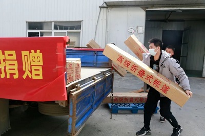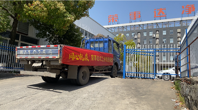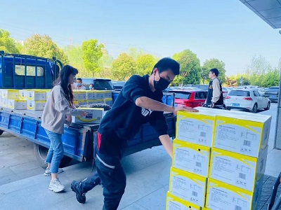 4月8日榮事達(dá)水工業(yè)集團(tuán)工作人員以最快的速度進(jìn)行物資的裝載,滿載著抗疫物資,發(fā)往37℃的愛活動(dòng)統(tǒng)籌處。