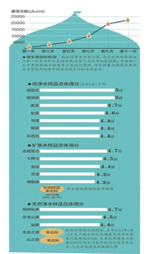 本次比較試驗(yàn)還模擬日常飲用水習(xí)慣,在設(shè)計(jì)的檢測(cè)周期內(nèi),每天取一定水樣,定時(shí)監(jiān)測(cè)菌落總數(shù)。實(shí)驗(yàn)中,大多數(shù)水樣隨著開瓶時(shí)間越來越長(zhǎng),菌落總數(shù)呈增長(zhǎng)趨勢(shì),開瓶第5-7天后,出現(xiàn)急劇增長(zhǎng)態(tài)勢(shì)。