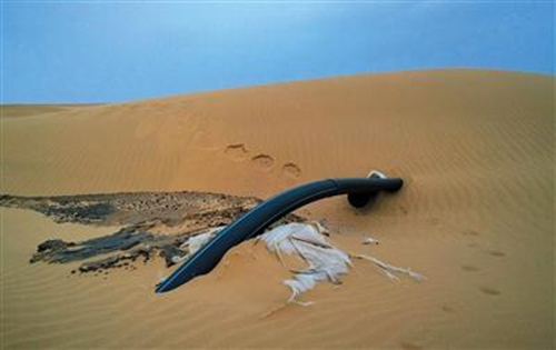 記者看到,每個排污池都有一個到數(shù)個白色“玻璃鋼夾砂”管道通向沙漠,方向指向工業(yè)園。在排污池和化工園區(qū)之間的一公里多都是沙漠,記者從排污池向化工園區(qū)方向行走,不時可以看見暴露在外面的排污管道,在一些洼地,還可以看到一些直接向下插入沙土里的黑色橡膠管道,這些管道周邊的細(xì)沙呈黑色。踢開表面,下面是黑色泥漿般的凝結(jié)物,發(fā)出一股惡臭味。