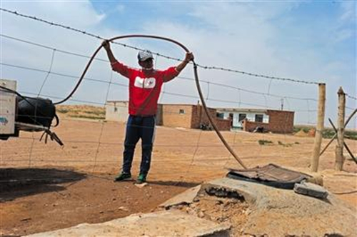 額里斯鎮(zhèn)特莫烏拉嘎察(村民組),是最接近化工園區(qū)的村民組,最近的居民離化工園區(qū)不過1公里。20歲的巴特爾(化名)就是這里的居民,記者看到他正在用太陽能發(fā)電機(jī),從自家水井抽水注入儲水皮囊中,準(zhǔn)備澆灌幾里外菜園里的青菜。巴特爾的家在騰格里沙漠水源地上游,幾年前幾米下就能抽上水,現(xiàn)在水位下降至少40多米。